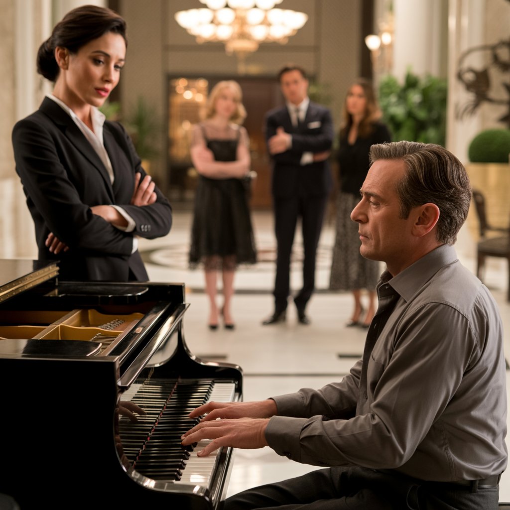 Der Geschäftsführer lehnte sich in seinem ledernen Chefsessel zurück, ein spöttisches Grinsen auf den Lippen, während er auf den glänzenden schwarzen Flügel in der Ecke der Empfangshalle zeigte. “Spielen Sie dieses Klavier”, höhnte er, und ich verdopple ihr Gehalt, wenn Sie überhaupt einen Ton zustande bringen.
