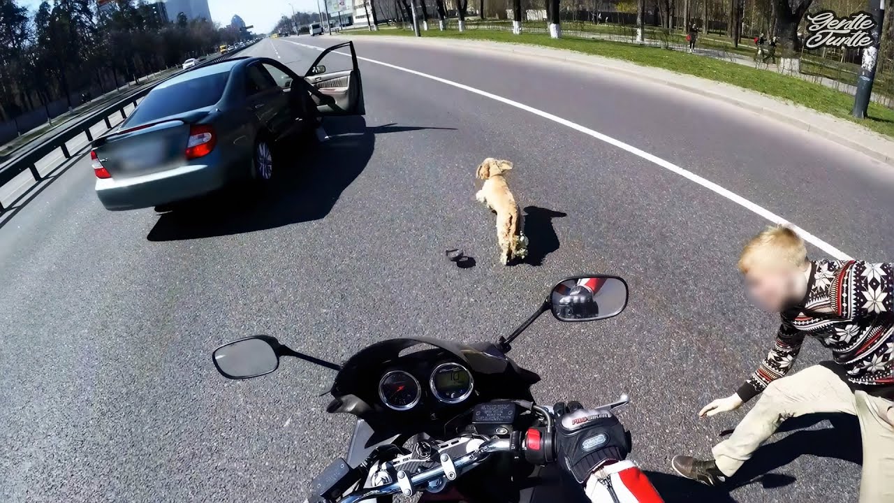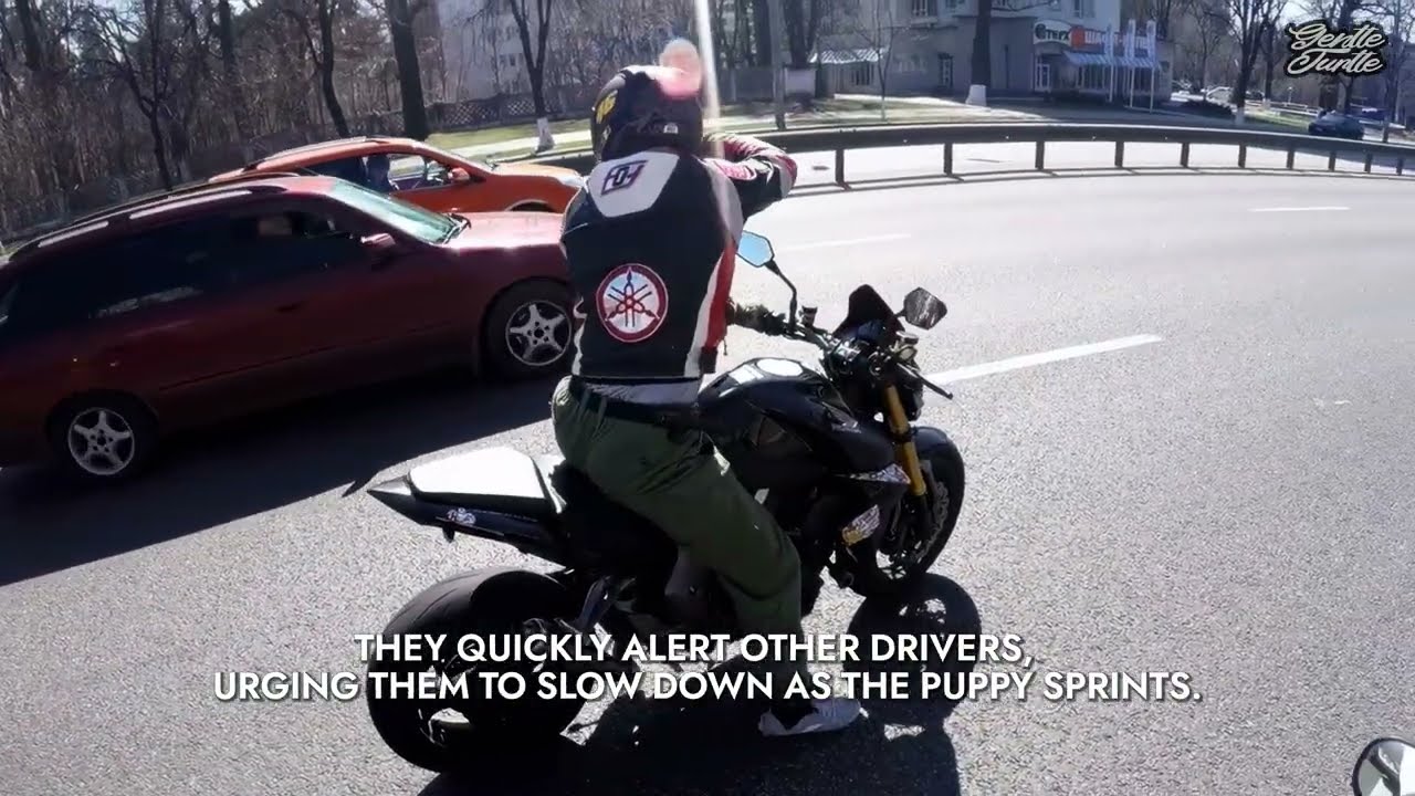 Die anderen Motorradfahrer bildeten eine Schutzlinie, hielt die vorbeifahrenden Autos ab, während Tom den Welpen in Sicherheit brachte. Herzklopfen, Adrenalin, Erleichterung – die Szene wirkte wie aus einem Actionfilm, doch es war purer, echter Mut, Herz und Instinkt.
