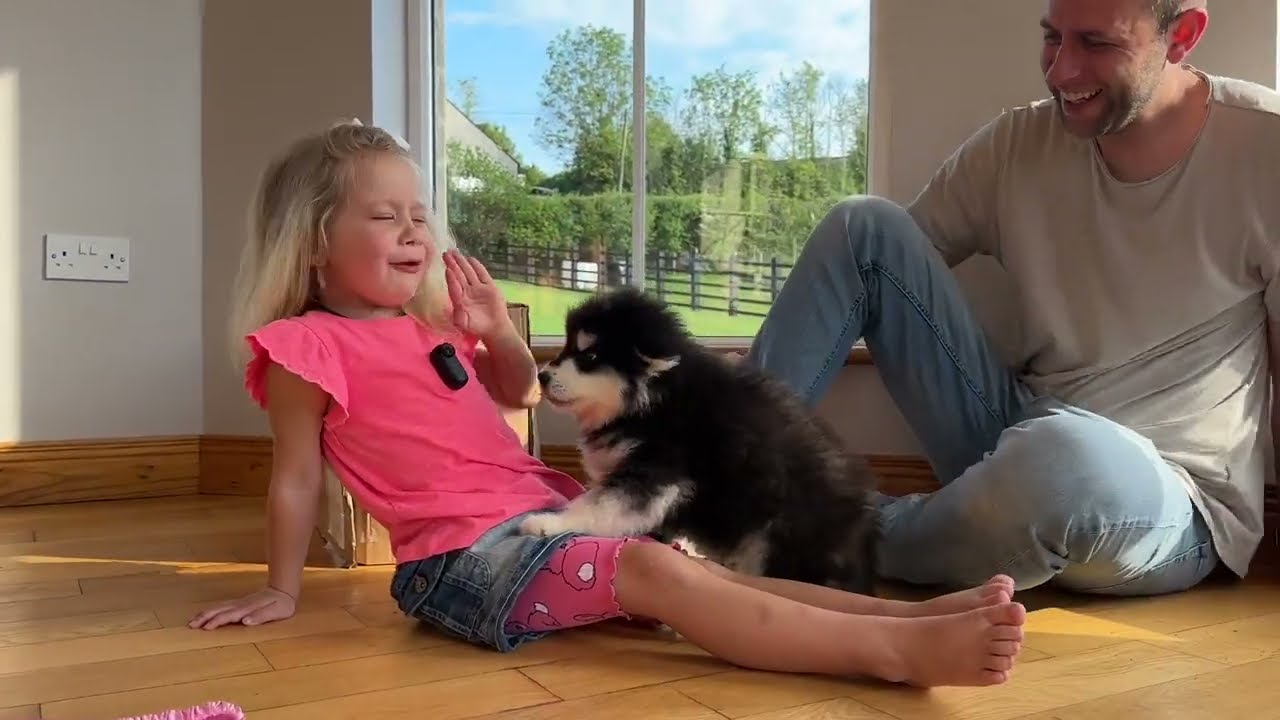 Stunden vergingen wie Minuten. Emma und der Malamute erkundeten gemeinsam das Zimmer, jagten imaginären Bällen nach, rollten über Teppiche und lachten. Jedes Mal, wenn der Welpe aufsprang, um ein Spielzeug zu holen, lachte Emma auf, ihre Augen funkelten, ihr Herz war voller Freude. Die Eltern machten Fotos, lachten leise und wussten: Dieser Tag würde für immer in Erinnerung bleiben.