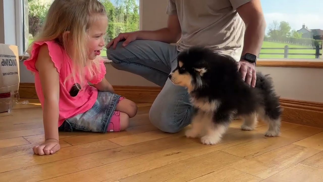 Herzerwärmender Moment – ein kleines Mädchen trifft zum ersten Mal auf einen flauschigen Malamute-Welpen, während die Welt stillzustehen scheint, Blicke sich treffen, und ein unbeschreibliches Band entsteht 🐶💖 – Wer hätte gedacht, dass ein Augenblick voller Staunen, Lachen und purer Freude eine Verbindung schaffen könnte, die stärker ist als jede Sprache?